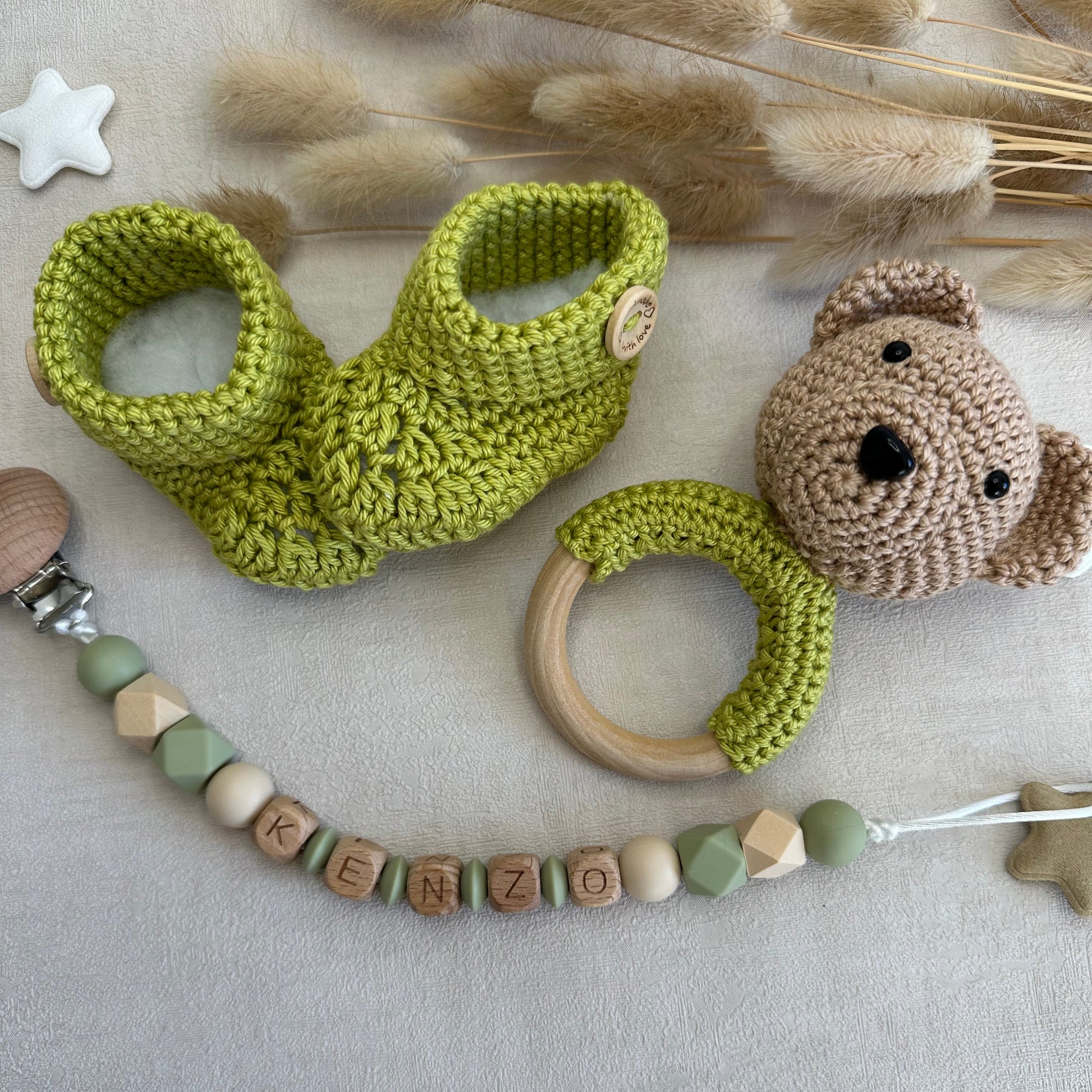 - Gaston, le petit ourson, est accompagné d'une paire de chaussons et d'une attache tétine.
