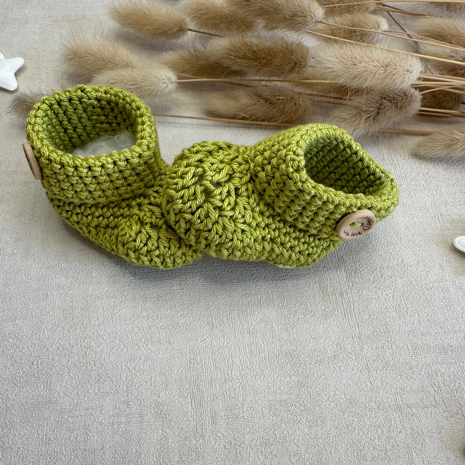 - Les chaussons sont crochetés à partir de coton doux et accompagnés de boutons brodés sur le côté.